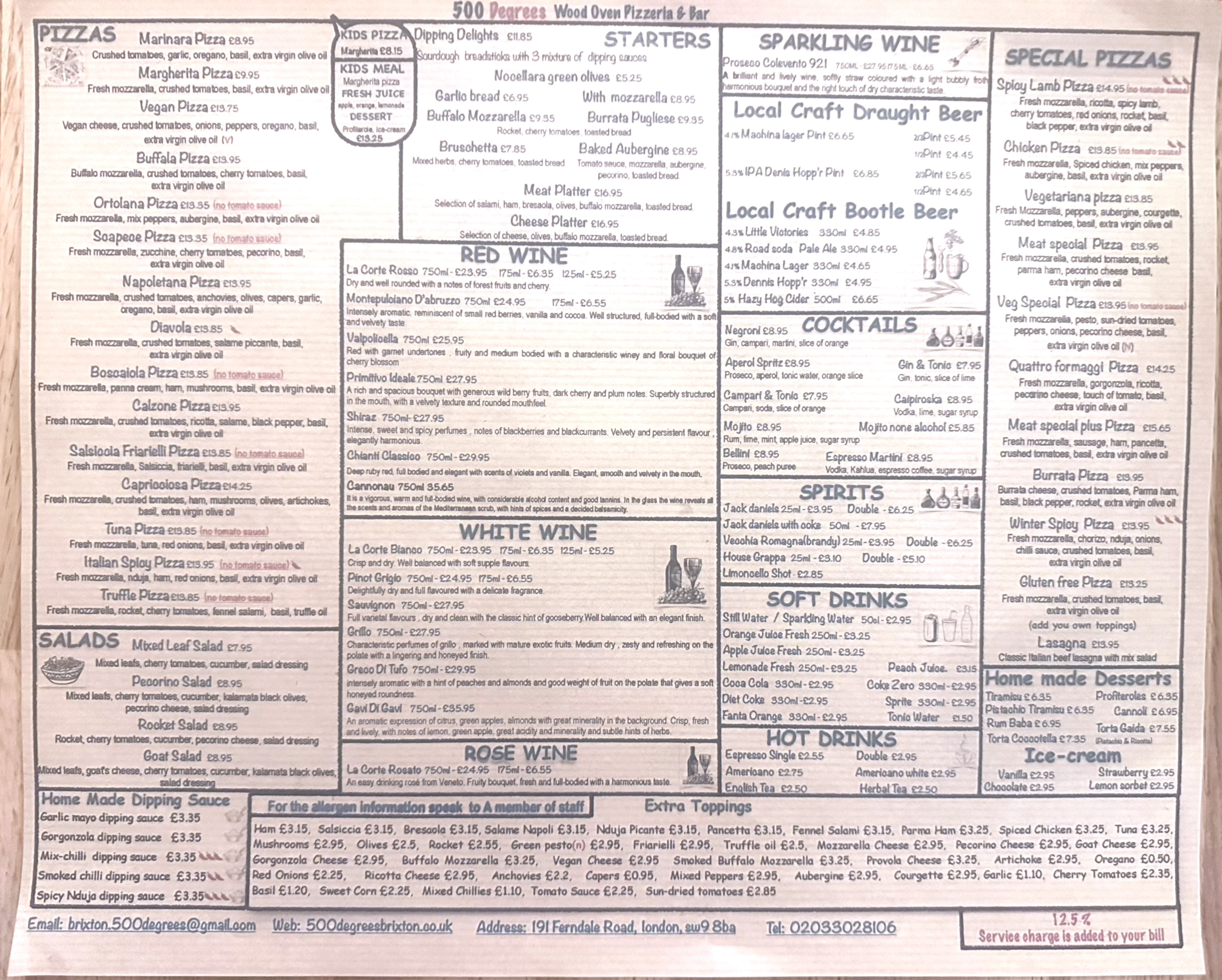 Menu from 500 Degrees Brixton