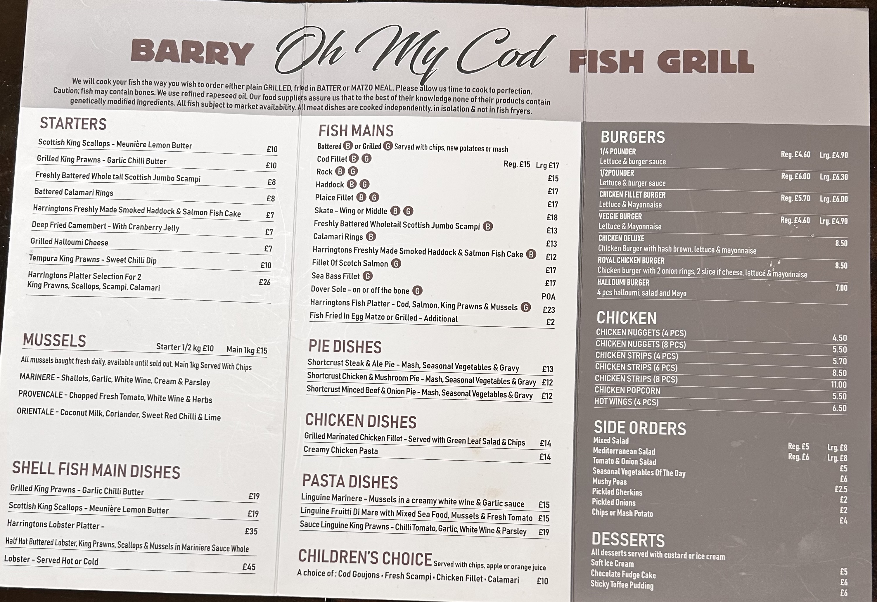 What's the restaurant buzz at Barry Oh My Cod Fish Grill all about? Great Fish food and beverages keeps diners coming back for more at Barry Oh My Cod Fish Grill. Located near Potters Bar in Potters Bar, Barry Oh My Cod Fish Grill features dishes like Seafood, Fish & Chips, British. Check out what sets Barry Oh My Cod Fish Grill apart from other restaurants in Potters Bar and book a table today to enjoy your next meal out!