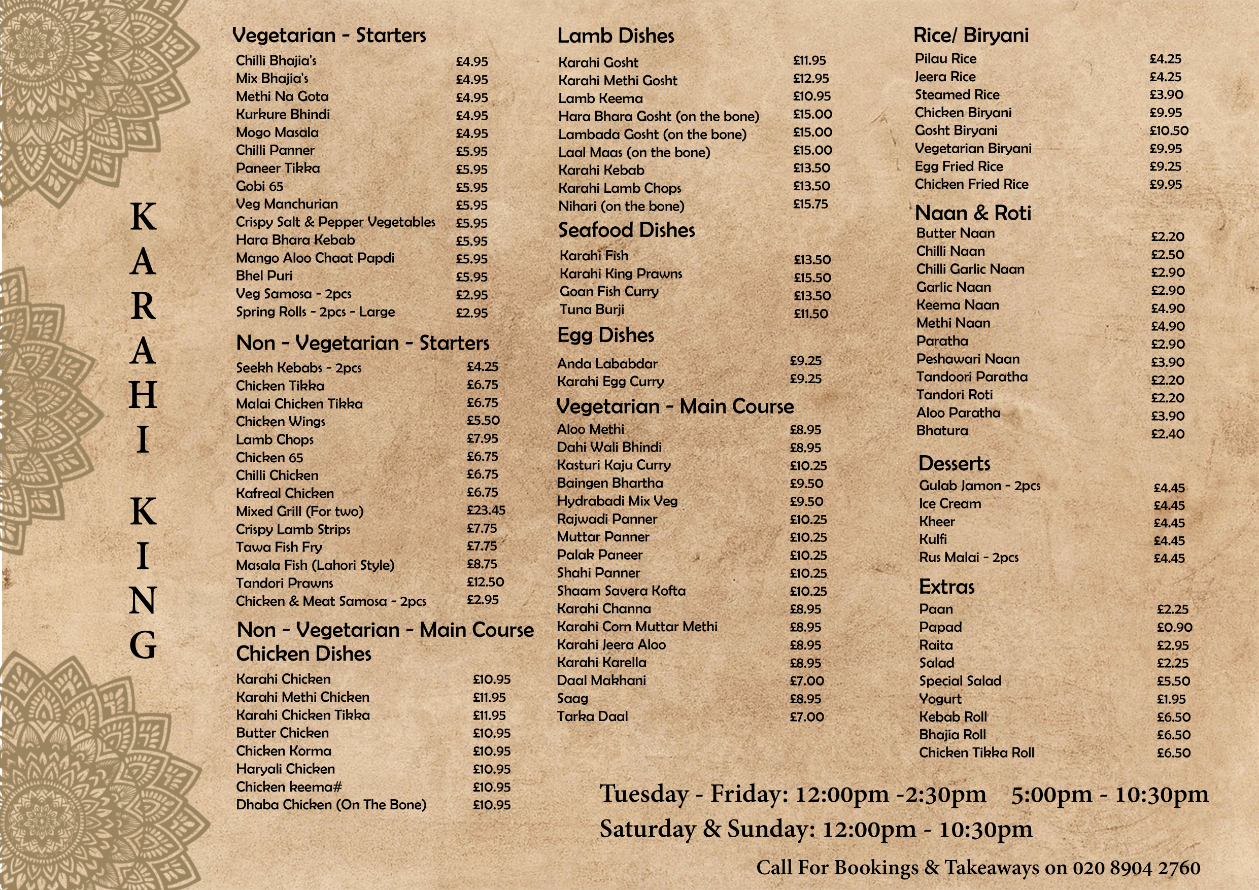 Karahi King is a Bar located at 213 East Lane, Wembley, London HA0 3NG. Karahi King is a popular spot in the Wembley area. Whether you're looking for a light bite or the full foodie experience, explore the dishes at Karahi King and experience authentic Indian food in London.