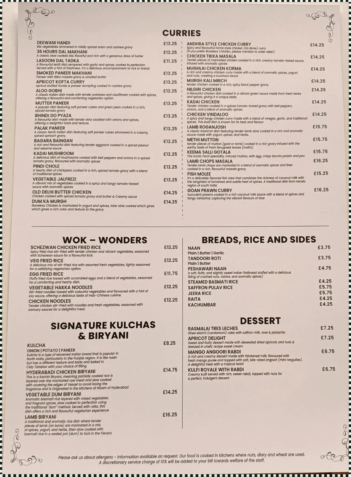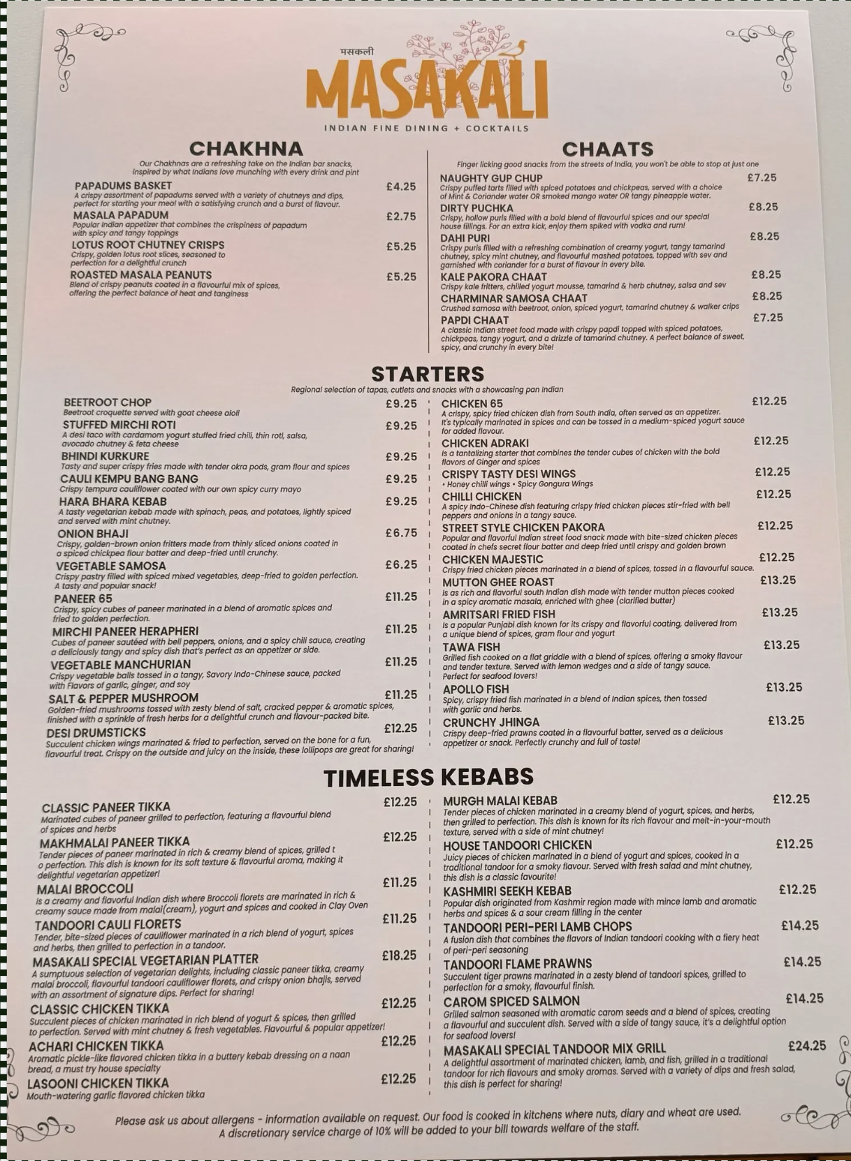 Menu from Masakali Restaurant Reading