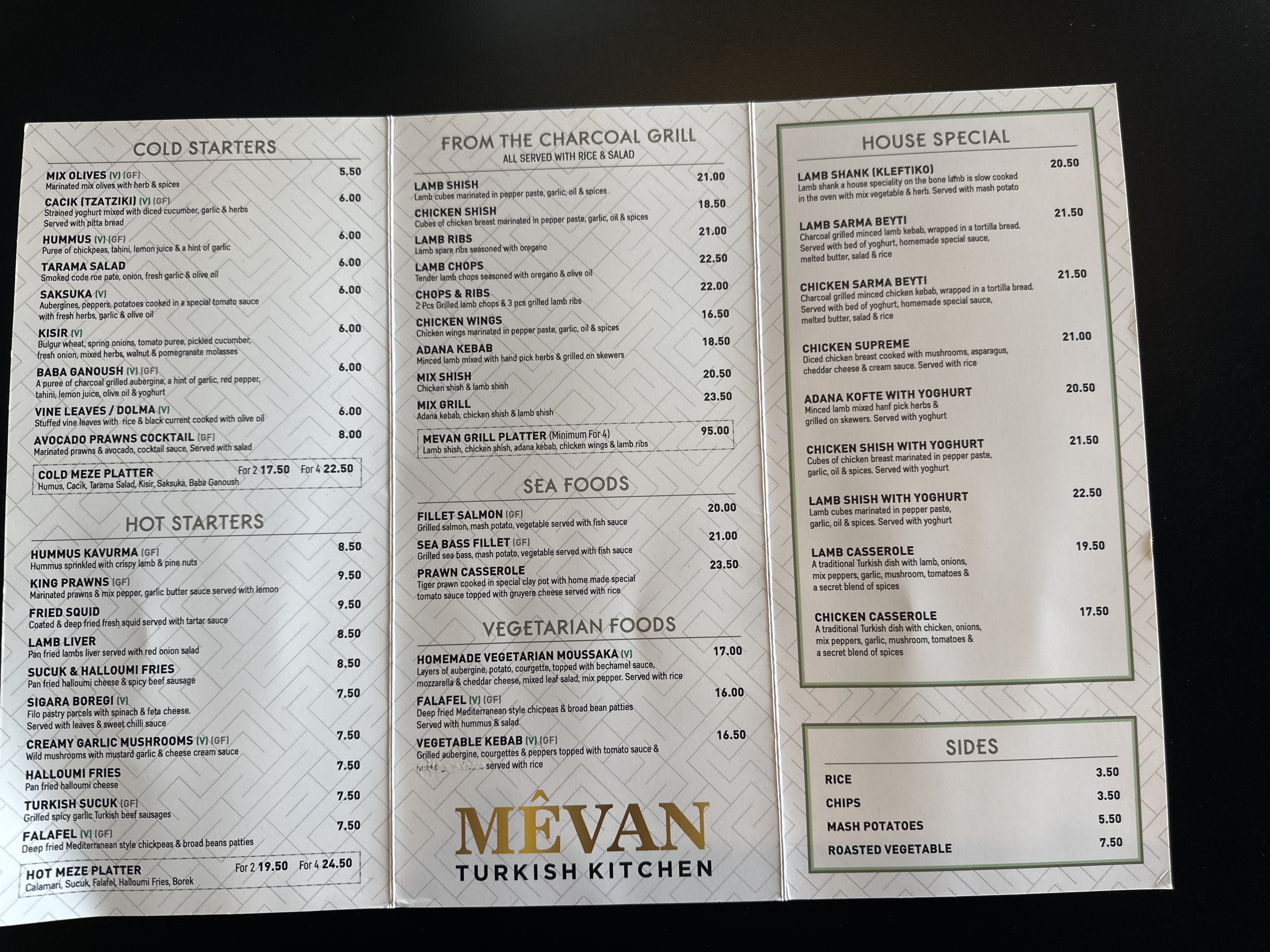 Menu from Mevan Turkish Kitchen - Hadleigh
