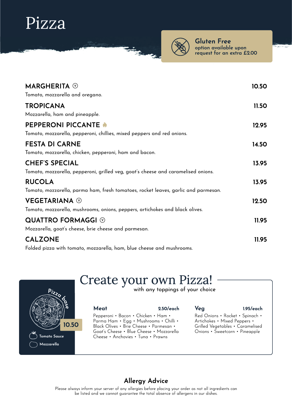 Tomato, mozzarella, pepperoni, grilled veg, goat's cheese, caramelised onions.