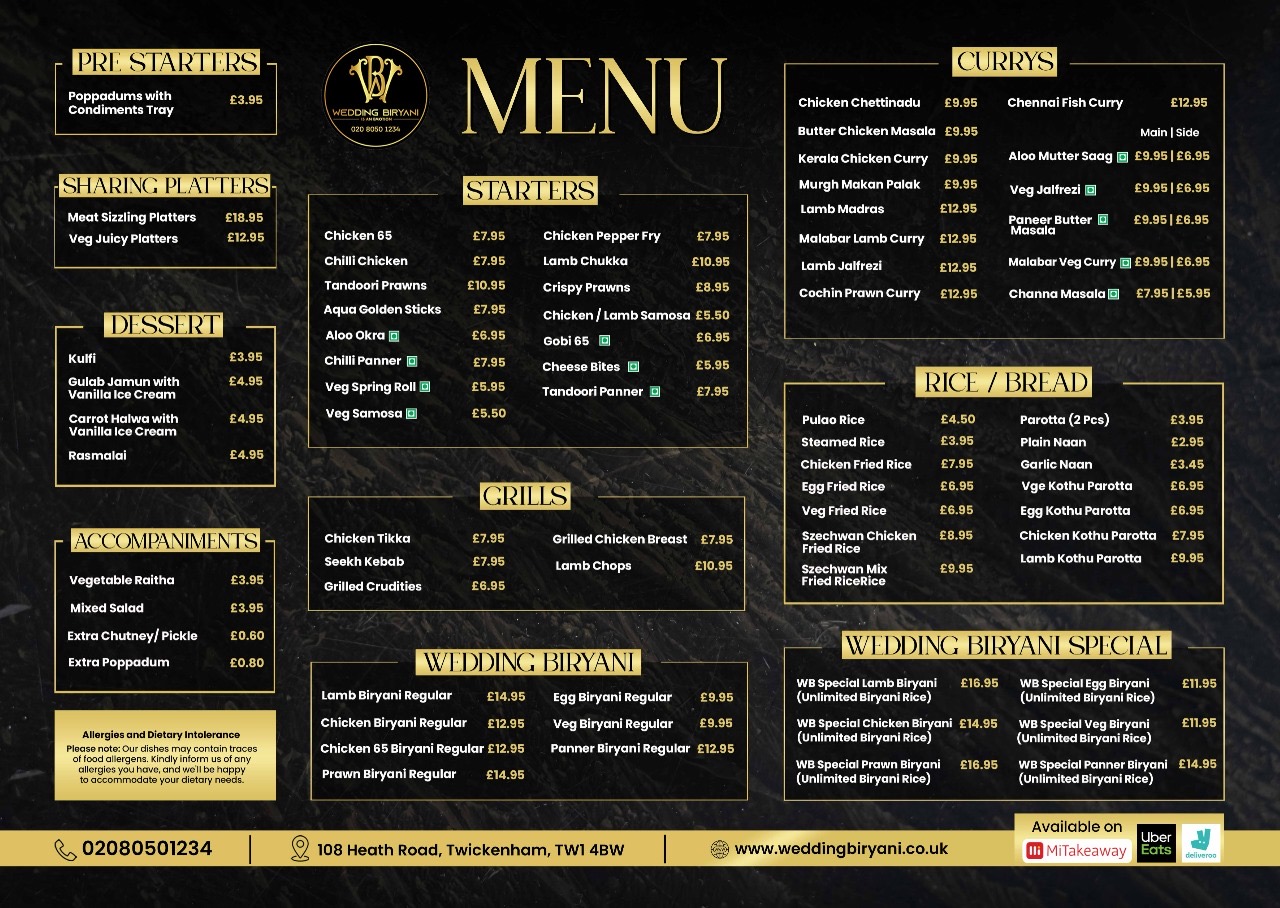 Menu from Wedding Biryani